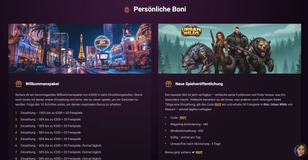 Onze welkomstdeal is verdeeld over meerdere stortingen, zodat je de waarde over tijd kunt claimen in plaats van alles in één keer. Bij je eerste storting ontvang je een 100% match tot €200 plus 20 free spins, met een minimale storting van €20. De wagering is 50x, en dezelfde wagering geldt voor de vervolgstappen van de welkomstbonus.